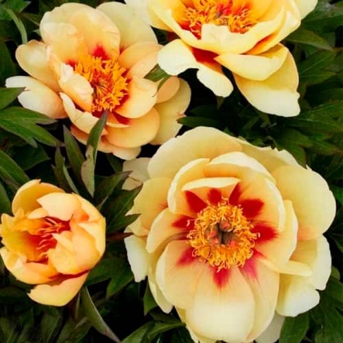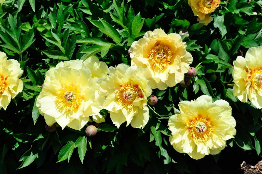 Гибридные сорта древовидных пионов, у которых цветки яркой желтой окраски, способны цвести повторно – они обычно уходят на зимовку с уже сформировавшимися цветочными почками, и лучше всего годятся для внеурочной выгонки в горшках.