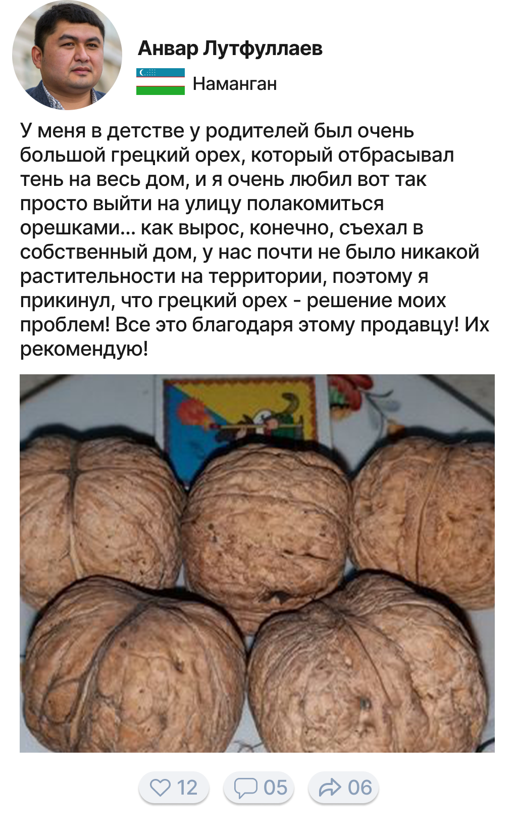 Грецкий орех — очень ценный вид дерева, и мы часто не понимаем, что растет у нас под ногами, каким богатством мы обладаем. Грецкий орех очень часто используют в производстве дорогой мебели, орех имеет очень красивый цвет и структуру дерева. Я с семьей выращиваю орехи на продажу уже более 20 лет. 5 лет назад мы начали продавать ореховые саженцы нашим клиентам и каждый раз радуемся, когда им удается вырастить собственные ореховые сады!