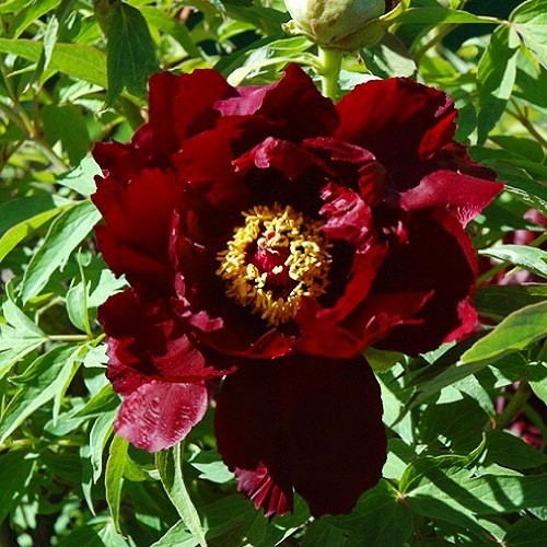 Великолепный пион Као древовидный способен достичь высоты 120-150 см. Его крупные густомахровые соцветия диаметром 20-25 см с желтой сердцевиной поражают удивительными оттенками рубина, пурпура и коралла. Обильно цветет в мае 8-15 дней, окутывая сад легким пряным ароматом.